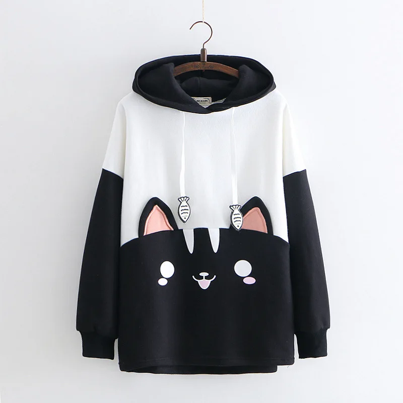 90% OFF Sweatshirts female cartoon color matching black and white cat eat fish embroidery Female easing stu